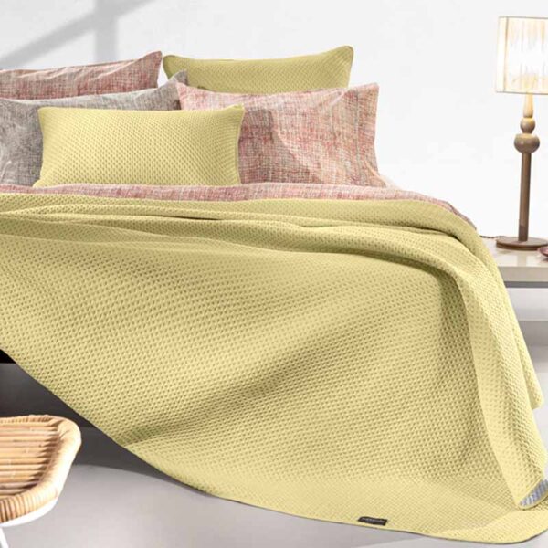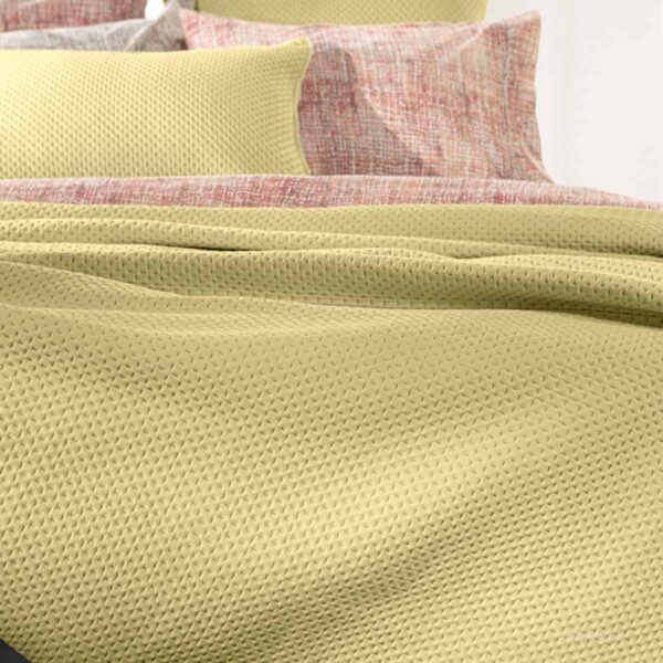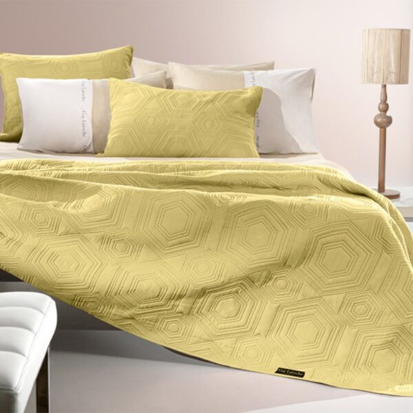 €60.00Κουβερλί γίγας με ανάγλυφο γεωμετρικό σχέδιο και λαχανί χρώμα από την εταιρεία Guy Laroche. Το εξωτερικό ύφασμα είναι κατασκευασμένο από 100% microfiber ενώ εσωτερικά διαθέτει λεπτή πολυεστερική βάτα, που το καθιστά ιδανικό ανοιξιάτικο και καλοκαιρινό σκέπασμα.