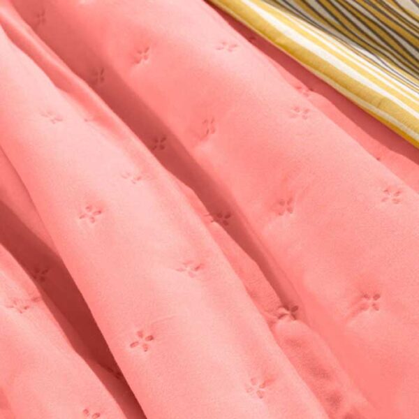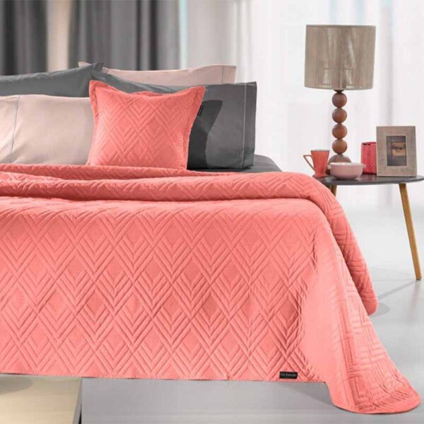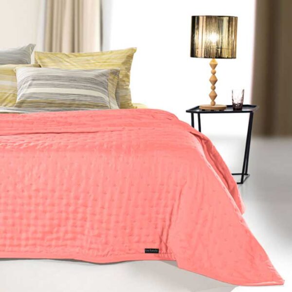 €60.00Κουβερλί γίγας με καπιτονέ ανάγλυφο σχέδιο και κοραλί χρώμα από την εταιρεία Guy Laroche. Το εξωτερικό ύφασμα είναι κατασκευασμένο από 100% microfiber ενώ εσωτερικά διαθέτει λεπτή πολυεστερική βάτα, που το καθιστά ιδανικό ανοιξιάτικο και καλοκαιρινό σκέπασμα. Το σετ περιλαμβάνει και την μαξιλαροθήκη oxford 50×50 με το ίδιο σχέδιο.