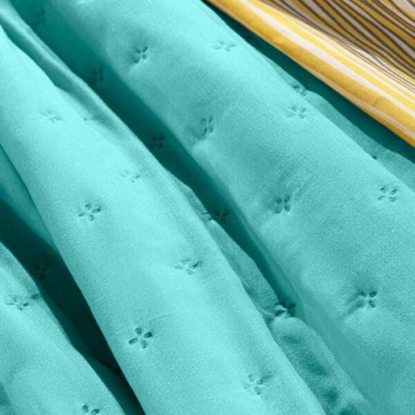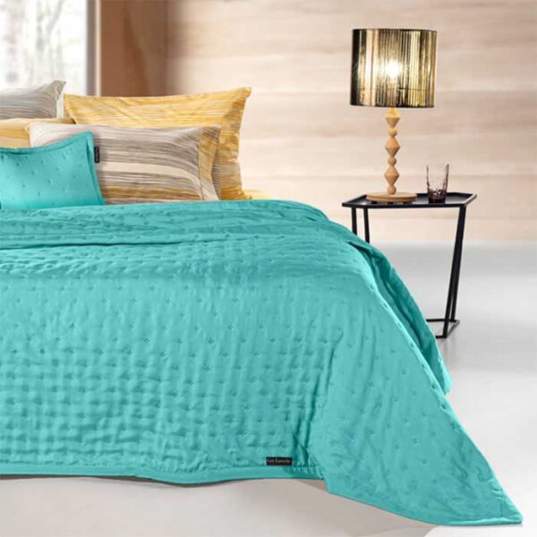 €40.00Κουβερλί μονό με καπιτονέ ανάγλυφο σχέδιο και πετρόλ χρώμα από την εταιρεία Guy Laroche. Το εξωτερικό ύφασμα είναι κατασκευασμένο από 100% microfiber ενώ εσωτερικά διαθέτει λεπτή πολυεστερική βάτα, που το καθιστά ιδανικό ανοιξιάτικο και καλοκαιρινό σκέπασμα. Το σετ περιλαμβάνει και την μαξιλαροθήκη oxford 45×45 με το ίδιο σχέδιο.